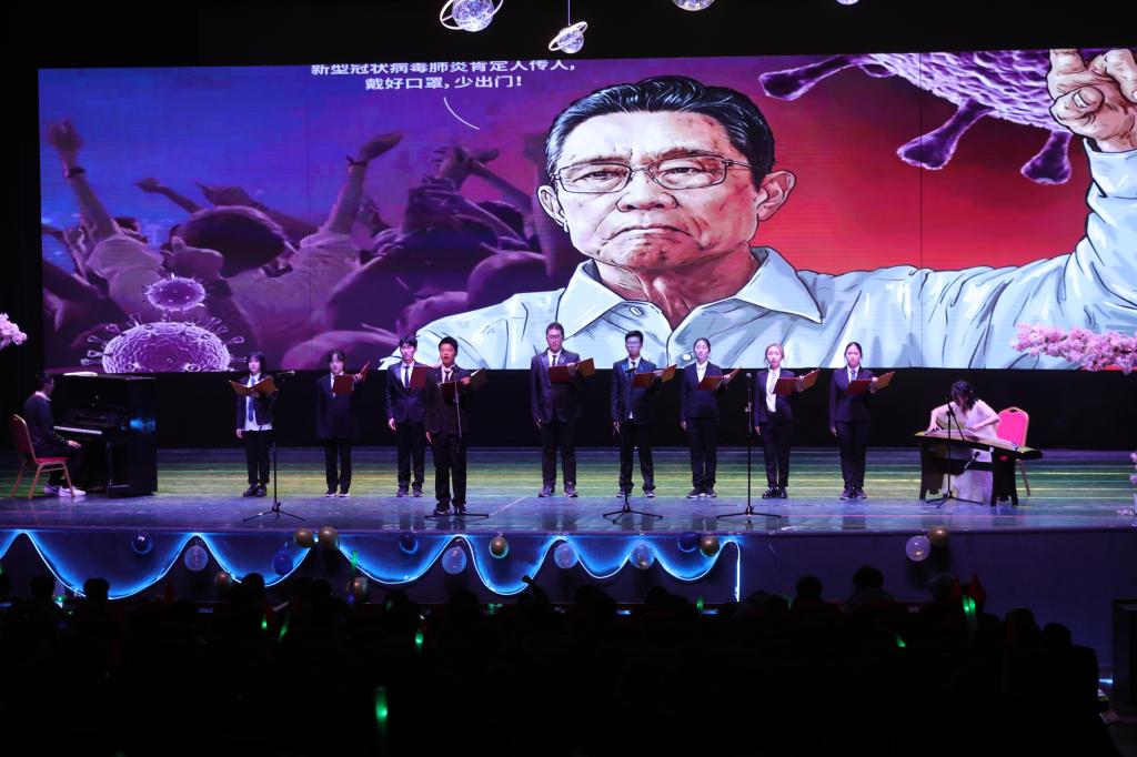 晚会在勿氧乐队的乐器演奏中拉开帷幕,舞蹈《天选之城》紧随其后点燃全场,拉开晚会盛宴的帷幕。十佳歌手梁肖瑶、兰康带来的《I Love You 3000》歌声优美,旋律动听,令全场观众沉浸其中;相声《报菜名》,捧逗俱佳,令观众捧腹大笑;由教师带来的歌曲串烧和走秀,引来学生的连连掌声,全场学生为走下讲台站上舞台的老师们喝彩呐喊;过程2001班的诗朗诵《我们一起走过,奔向远方》,在优雅钢琴声和袅袅古筝音的烘托下,生动的讲述了中国的抗疫故事,歌颂了我国的抗疫精神。最后,伴随君远师生的大合唱《我和我的祖国》,晚会在一片欢声笑语中落下帷幕。