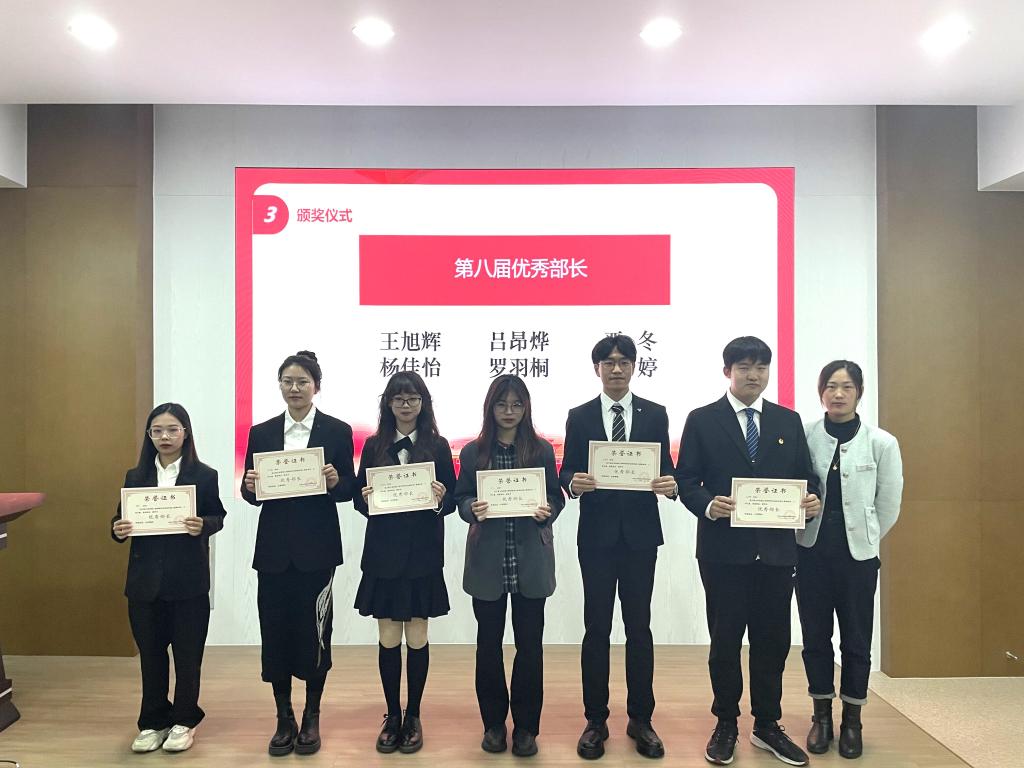 大会在历届主席团成员的祝福视频中拉开序幕。他们讲述亲身经历,回顾在学生会的收获,并寄语新成员们:要在学生会这个平台上不断历练、追求进步、团结向上,努力成就最好的自己。为做好学生会优良作风的传承,发挥好优秀榜样的作用,第八届学生会执行主席慕登斌同学代表主席团与第九届主席团进行交接。孟召双宣读第八届学院学生会表彰名单,并由方俊、孟召双、辅导员潘智琦分别为获得优秀主席、部长和干事代表们颁发荣誉证书。
