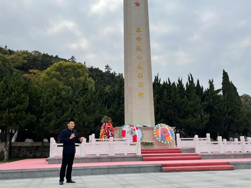 学院师生代表来到陵园广场,在陈宗昱的主持下举行了庄重肃穆的悼念仪式。师生们怀着崇高的敬意向烈士敬献花圈,在纪念碑前默哀,表达对先烈的敬意与深切哀悼。冯亚东致悼词,他勉励机械学子牢记革命历史,不忘先烈遗志,传承红色基因,厚植家国情怀。陈宗昱带领全体党员庄重宣誓,向革命烈士纪念碑三鞠躬,绕墓地一周,献上鲜花以表哀思。