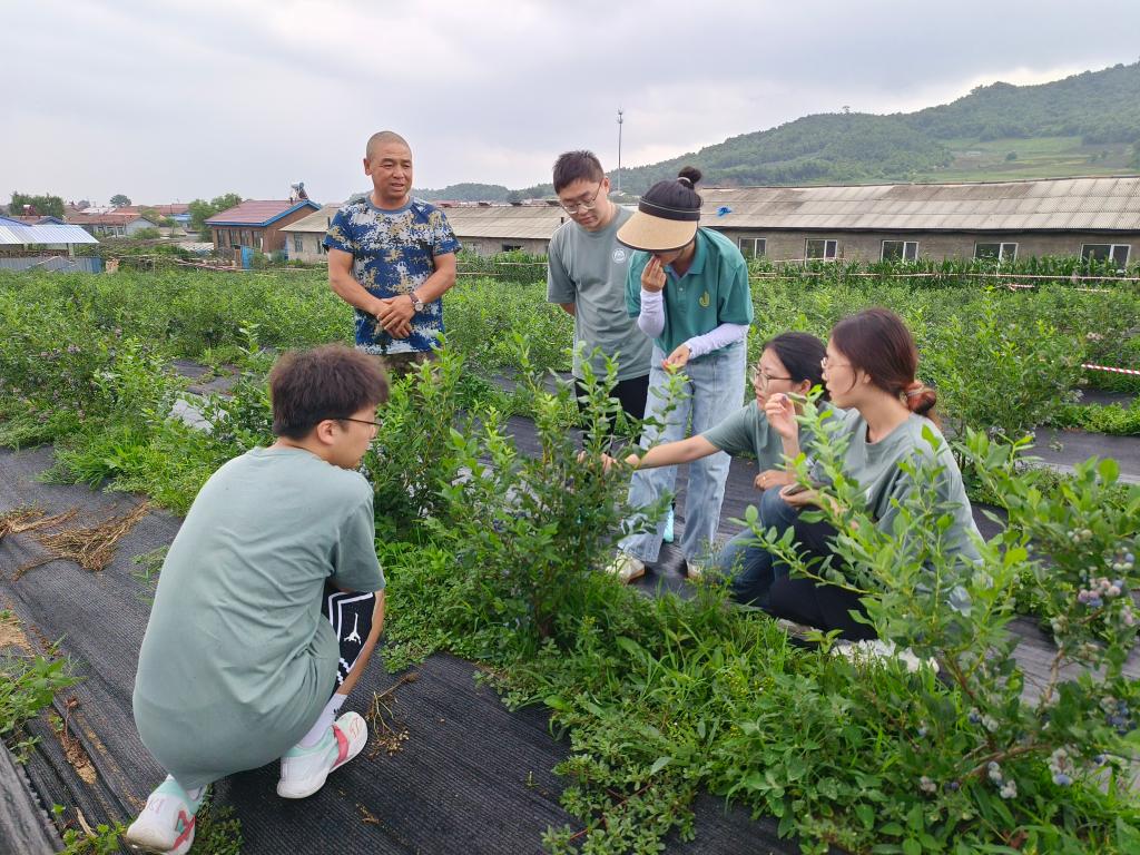 来到“长白山蓝莓第一镇”三道湖镇的东沟村,实践小队深入田间农舍走访调研。在烈日下与农民并肩劳作,帮助农户采摘、分装蓝莓,亲身体验‘汗滴禾下土’的辛苦。