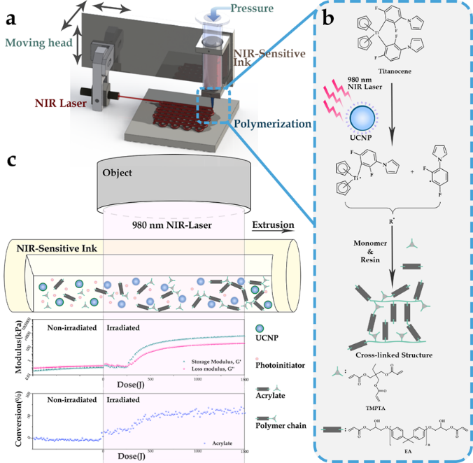 近日,我院刘禹教授团队在3D打印技术取得进展。刘禹教授团队与化工学院刘仁教授团队合作,创新近红外辅助3D墨水直写增材制造技术,实现多色彩材料、跨尺度(μm - mm)部件3D打印,打破了传统增材制造方法的材料与制造精度局限性,有望加速3D打印技术在柔性传感、软体机器人与生物医疗领域的应用。相关成果在顶级期刊《自然·通讯》发表题目为“3D printing of multi-scalable structures via high penetration near-infrared photopolymerization. Nat Commun 11, 3462 (2020). //doi.org/10.1038/s41467-020-17251-z” 的科研论文。机械学院作为共同通讯单位,刘禹教授与刘仁教授为通讯作者,化工学院博士生朱俊哲为第一作者,我院硕士生张强为第二作者。该研究得到了国家自然科学基金、江苏省食品先进制造装备与技术重点实验室等大力支持。