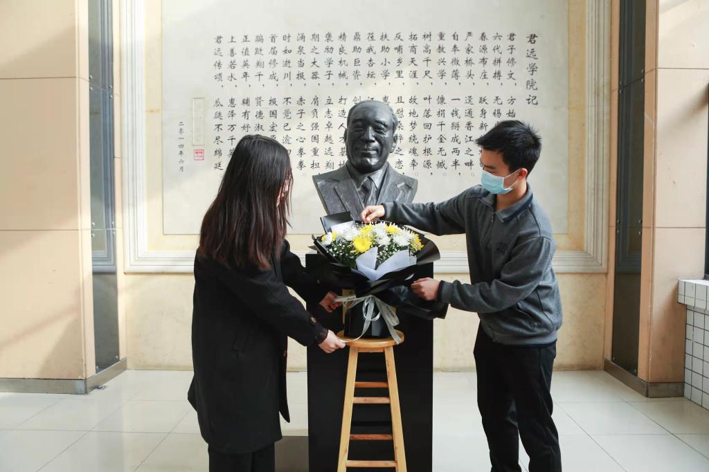 君远学院学生林丽英、彭默雷代表莘莘学子敬献鲜花,李可带领全体师生在塑像前三鞠躬默哀,再次表达对唐翔千先生的深切缅怀。