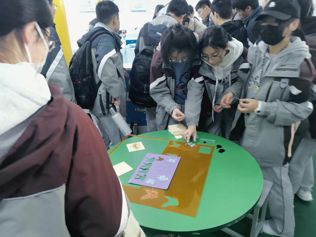 接着同学们分别对工业机器人实验室、特种加工实验室以及3D打印实验室进行了参观,期间展现出了高度热情与浓厚的兴趣。在工业机器人实验室左文娟老师详细介绍了工业生产中常见的机器人及其工作原理,通过视频展示了工业机器人在实际生产中运行过程。在工程训练中心的特种加工实验室,同学们在吕凤艳老师的讲解下,了解了特种加工—激光加工的加工原理和加工过程,刘书明老师向同学们介绍了3D打印技术的类型及对应的加工原理和加工过程,并现场演示了3D打印加工过程,通过理论和实践相结合的方式让学生深刻了解3D打印并激发他们的科学兴趣,利用激光加工技术现场制作的纪念品深受同学们的喜爱。