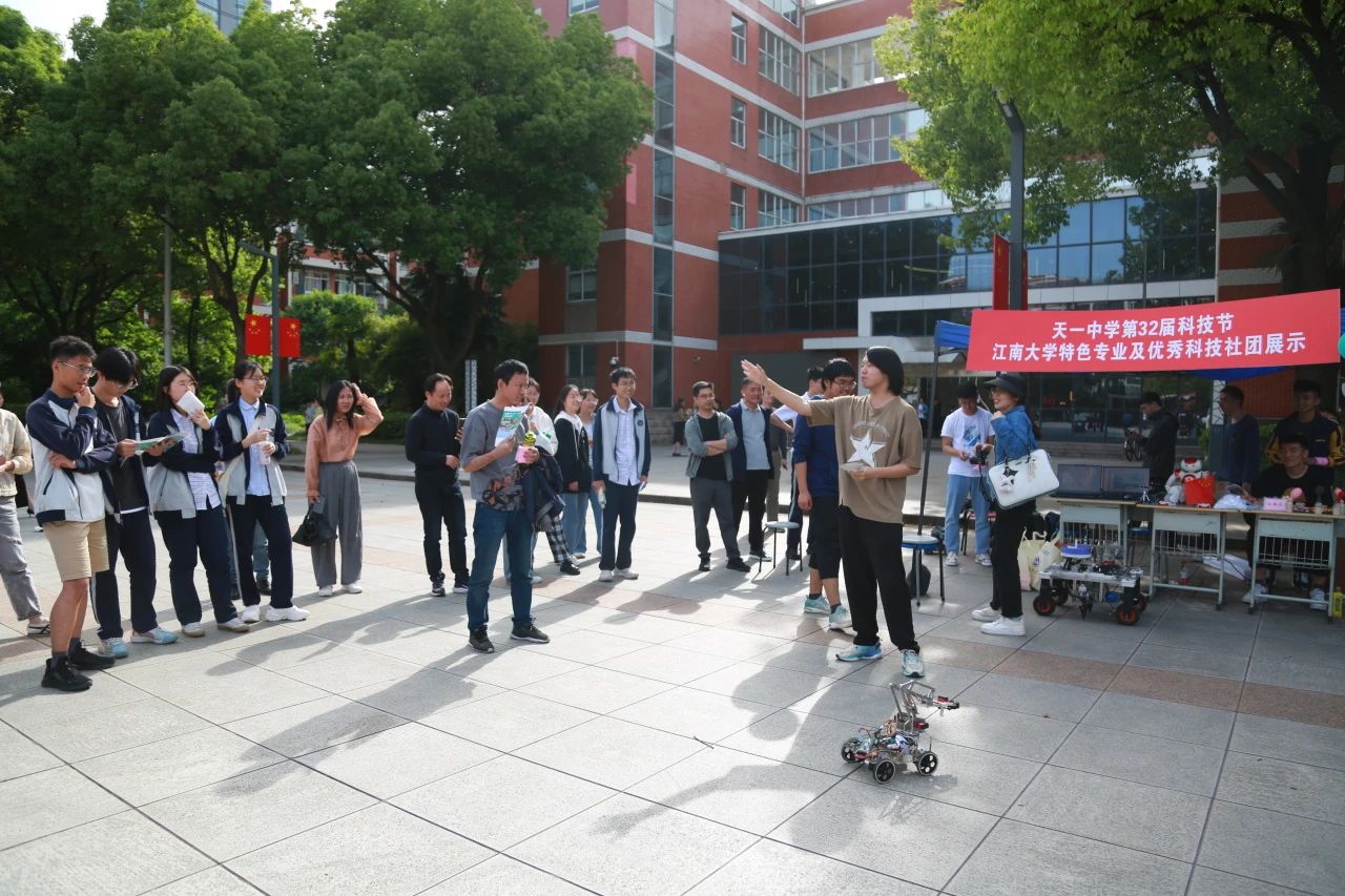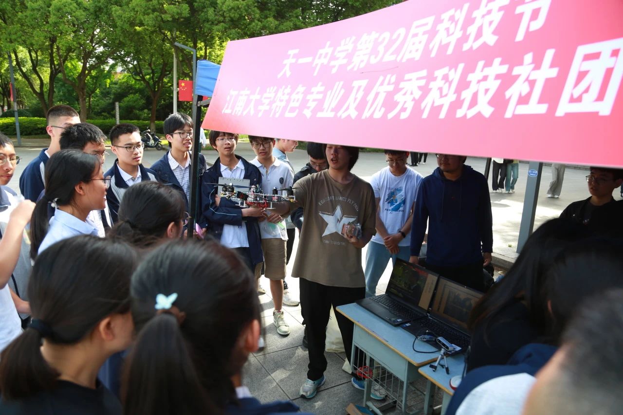 NAO人形机器人、哨兵小车、自制无人机在现场同样“大显身手”,在团队成员段永旺同学的操控下,机器人全身协调移动、翩翩起舞;哨兵小车灵活操控、精准定位跟踪;自制无人机实现自由飞翔。这些“黑科技”满满的装置展示了多项令人惊喜的技能,向中学生们展现了科技与创新的魅力,活动在天一学子中引发热烈反响,并收获师生一致好评。