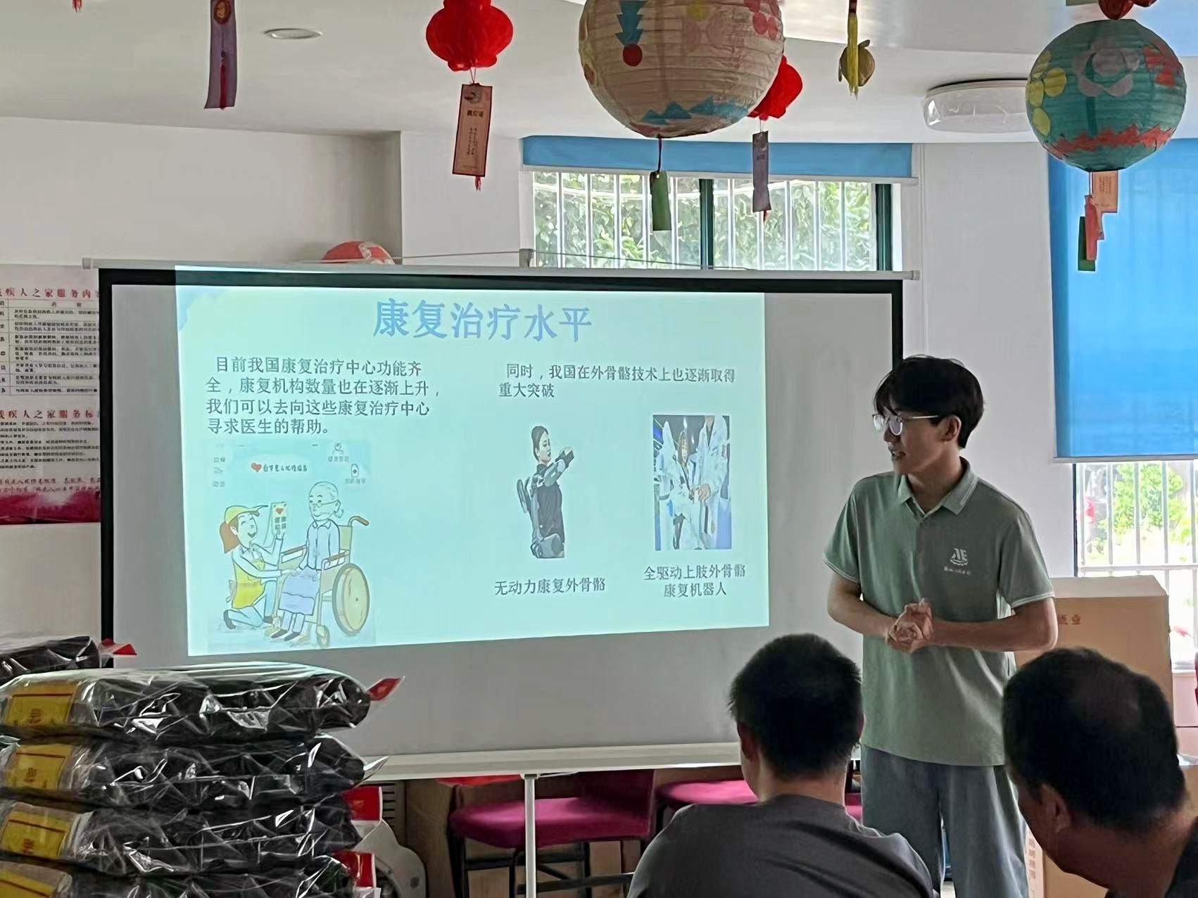 以更好帮助残友们提高身体控制能力、适应社会生活为标准,在宣讲中,团队成员向残友介绍部分适合他们的康复治疗手段,并由贾子璐、杜天天二位同学提出在除机器康复等治疗手段以外的日常生活中可以通过适当的运动健体操,例如“八段锦”、“五禽戏”等提高残友们的身体机能和对身体的控制能力。并在三天的学习和动作难度评估后,在宣讲过程中教学了“虎举”、“虎扑”、“鹿奔”、“熊运”、“熊晃”五式。