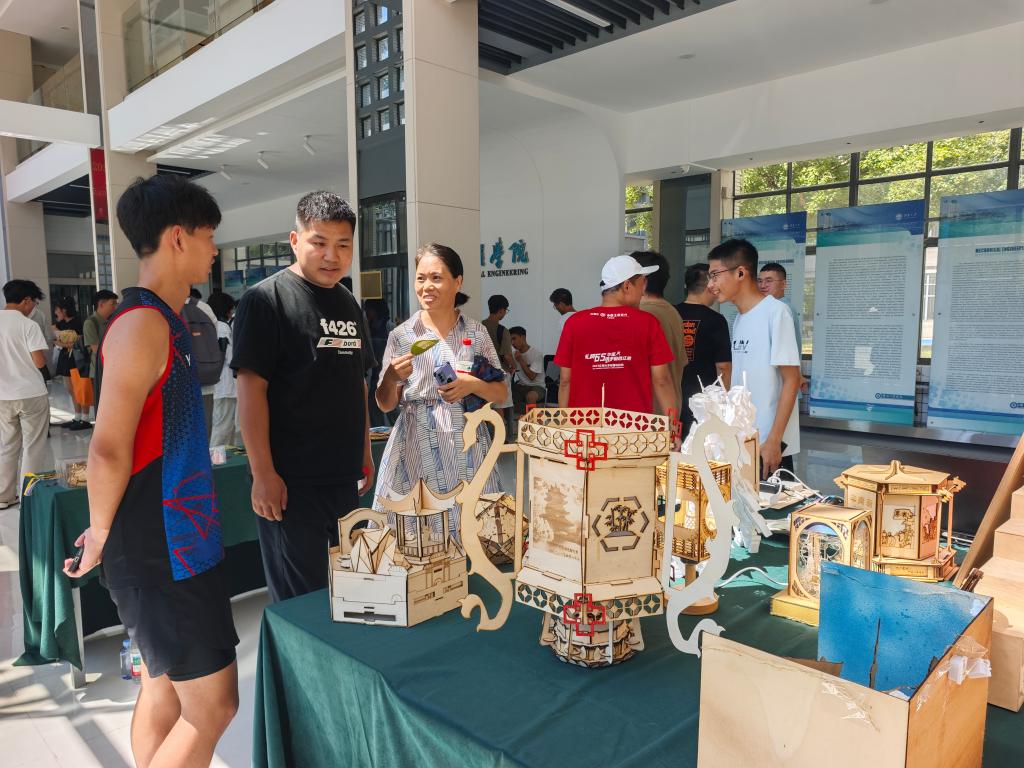 大厅内,各类科技展示与互动活动同步开展。学生社团现场演示激光叶雕技术,为新生定制专属纪念作品;曾在国家级竞赛中获奖的智能物流小车、智能分类垃圾桶等科技作品也进行了生动展示,吸引了大量新生及家长驻足交流。通过零距离接触专业相关创新实践,新生们提前感受到机械的魅力与无限可能。