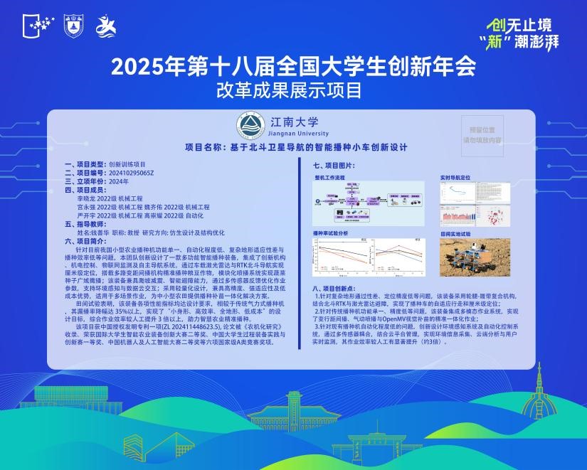 入选两项改革成果展示项目。项目一是《三“维”一体,“印”领未来——基于3D打印技术的多模态自适应三栖机器人》(指导老师:刘禹),基于仿生机器人学原理,设计一款可在水陆空三种环境中自主移动的多模态自适应三栖机器人,完成双层八翼结构建模、3D打印技术改进和单目视觉框架搭建开发,实现水陆空三模态的快速切换,为复杂环境运输勘察提供解决方案。项目二是《基于北斗卫星导航的智能播种小车创新设计》(指导老师:钱善华),针对目前我国小型农业播种机功能单一、自动化程度低、复杂地形适应性差等问题,创新设计了一款多功能智能播种装备,兼具轻量化、高精度、强适应性及低成本优势,适用于多场景作业,为中小型农田提供播种补苗一体化解决方案。