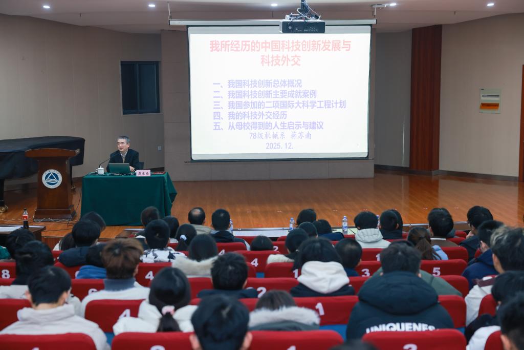 活动中,蒋苏南首先回顾了我国近代科技发展脉络,通过数据分析与国际比较,阐释了我国在创新能力、研发投入等方面取得的进展。随后,他结合北斗导航、航空航天、空间站等重大工程,介绍了我国关键科技领域的突破。在国际科技合作方面,他重点分享了参与国际热核聚变实验堆(ITER)和平方公里阵列射电望远镜(SKA)等项目的经历,展现了我国在全球科技合作中的角色与外交实践。