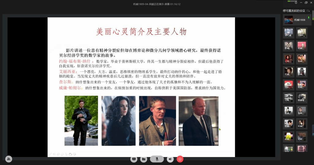会议由缪可嘉提前挑选了《美丽人生》、《放牛班的春天》、《肖申克的救赎》等十二部心理励志电影,同学分组观看后加以自己的理解,制作了解说、PPT、视频等形式的展示资料。在讨论交流过程中,同学们热烈地分享了电影带来的启发和感受。每组同学完成分享后,缪老师均会表达自己对该部电影的看法,并向同学们解释电影涉及的心理学原理和人生经验。其中,张正海、李昊同学分享了电影《当幸福来敲门》,他们被主人公在凄惨窘迫的境况下所表现出的坚强乐观、永不言弃所感动,也表明了自己学习这种精神的决心。吴颖、苑熙同学对《美丽心灵》进行总结:“伟人的一生尚且如此坎坷,更何况我们平凡人。但一路的坎坷,也是一路的风景,每一次的失望,是为了带来更大的希望。所以无论遇到什么困难,我们都应该选择坚定不移地走下去。”